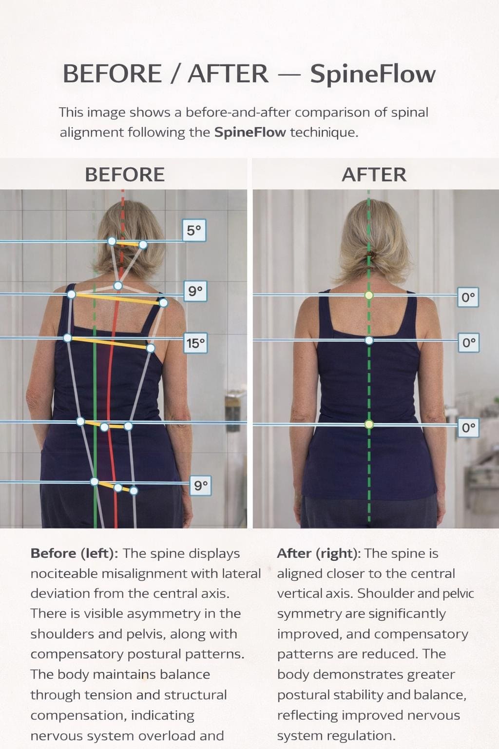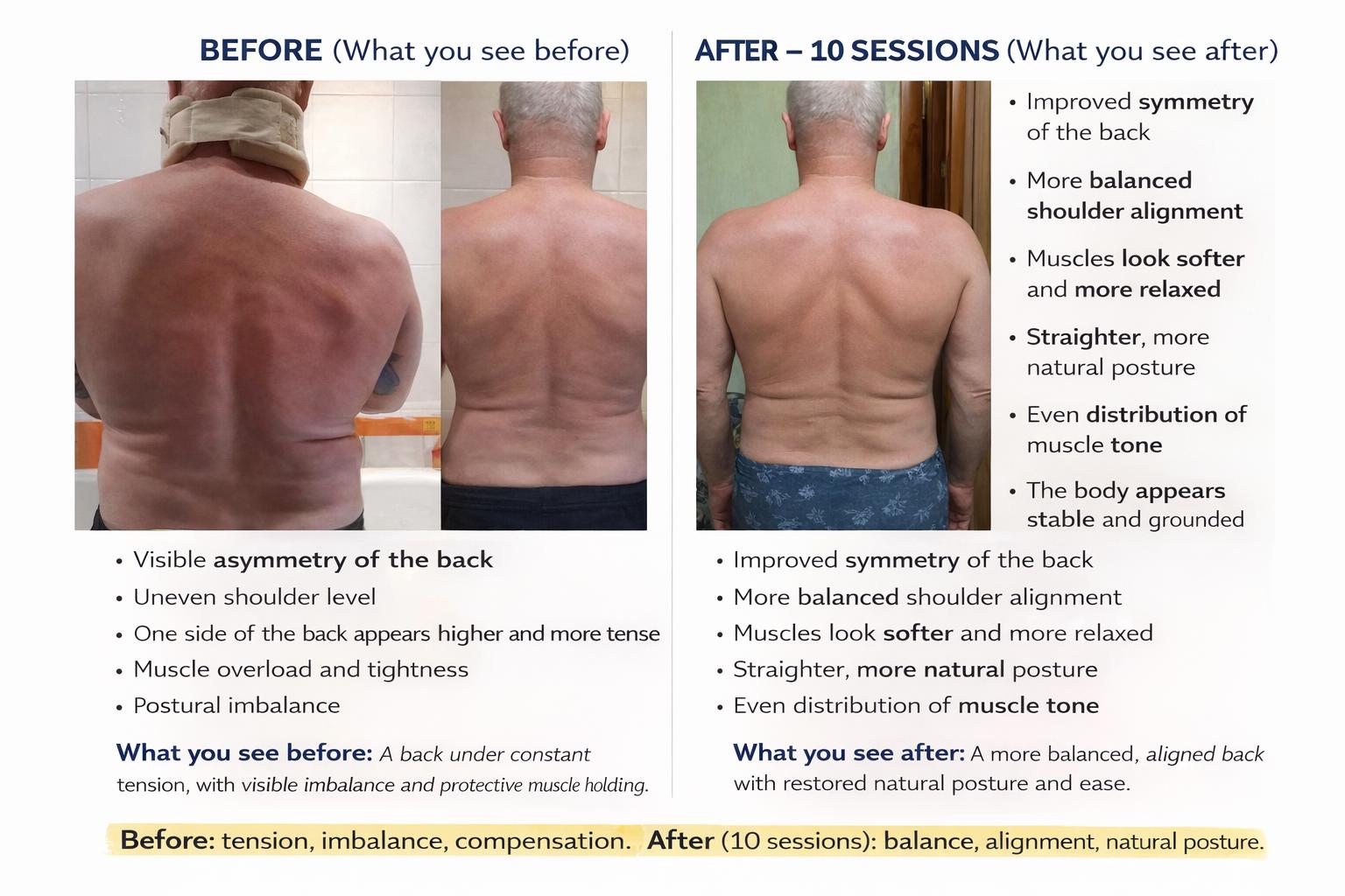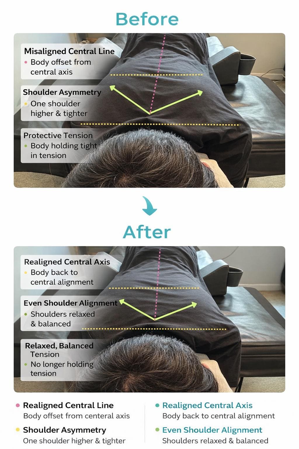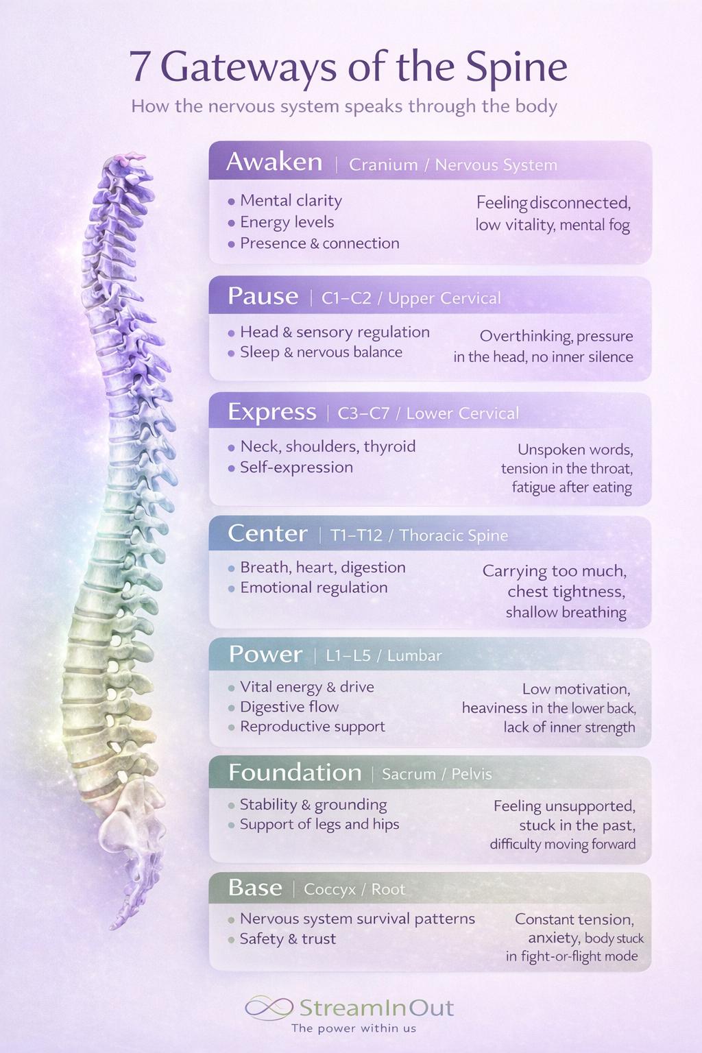 Through a combination of spinal work, energy-based stimulation, and nervous system support, the body begins to release what it has been holding for too long.